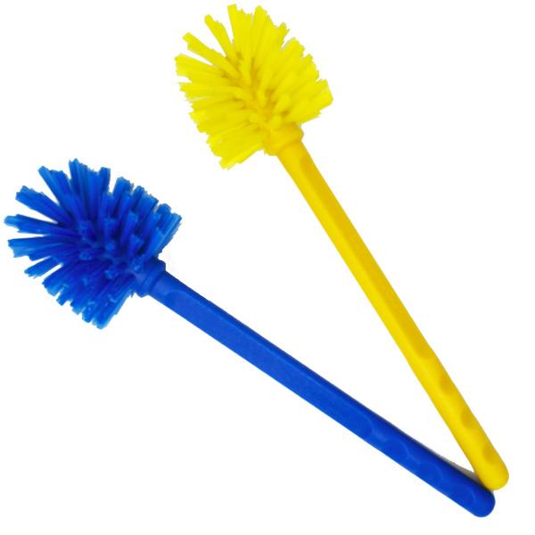 Escobillón de plástico para W.C., fabricado mediante proceso de engrapado de la fibra sobre un soporte plástico de polietileno con mango para manipulación. Es conocido como cepillo bola para W.C